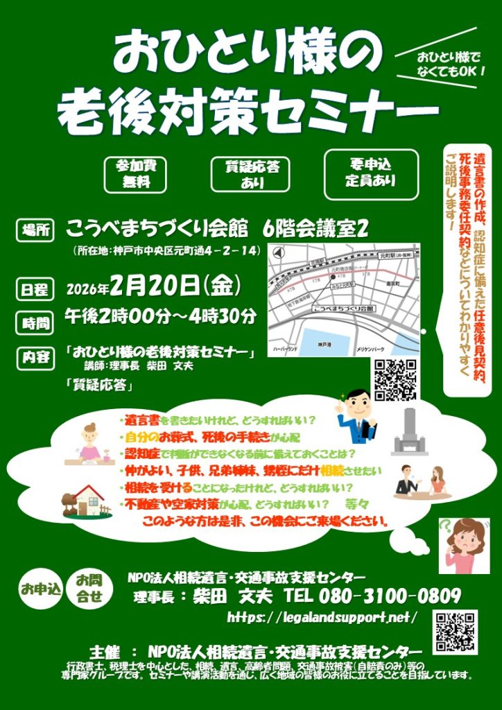 2026年2月おひとり様老後対策セミナー(神戸市中央区)ご案内 2026年1月26日 最終更新日時 : 2026年1月26日 fumio shibata 上記の要領にておひとり様老後対策セミナーを開催します。遺言書の書き方、任意後見契約等老後のご不安対策のお話をします。是非、お越しください。お申込みは上記チラシの「お問い合せ」先か、下記バナーの当HPのお問い合わせページからお願いします。 関連 FacebooktwitterHatenaPocketCopy